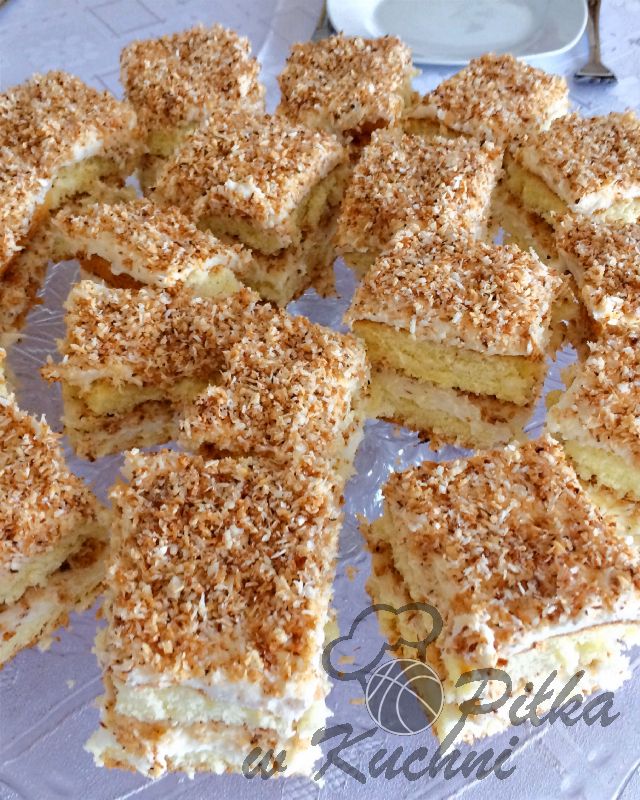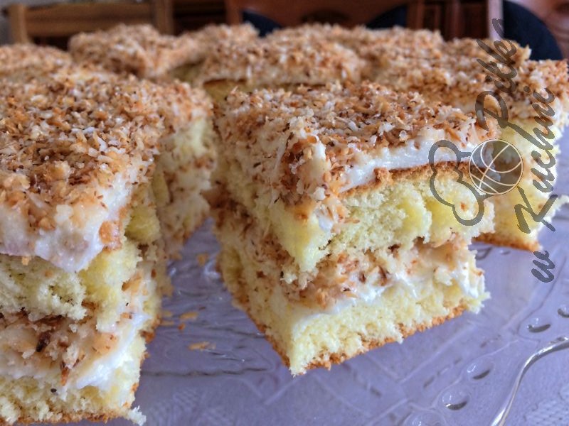 Biszkopt przekrój na pół. Posmaruj kremem pierwszy blat i przykryj drugim. Ponownie posmaruj kremem. Posyp uprażonymi wiórkami..