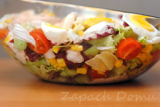 W ostatnie święta pokochałam sałatkę, którą moja teściowa nazywa "śmieciową". Zapytana o przepis powiedziała: "zaglądasz do lodówki, wrzucasz do miski to, co masz, polewasz sosem i gotowe" :) Kilkakrotnie robiłam inne wersje - takie "śmieciowe" i każda była pyszna. Sami się przekonajcie :)