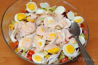 Z majonezu, ketchupu, owdy, oleju i przypraw przygotuj sos i polej sałatkę przed podaniem.
