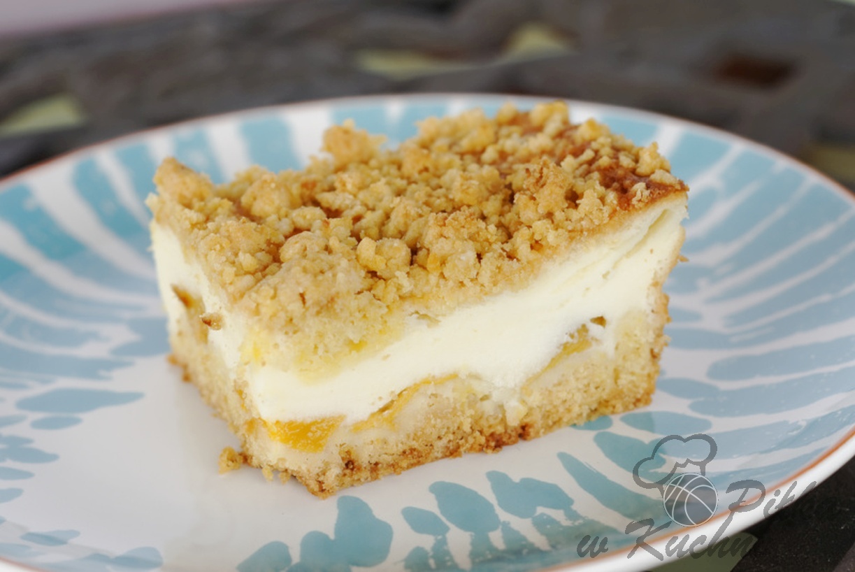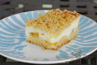 Blaszkę do pieczenia wyłóż papierem. Wylep ją 2/3 ciasta. Ułóż na nim pokrojone brzoskwinie.