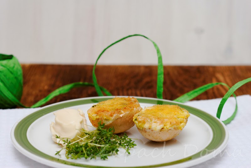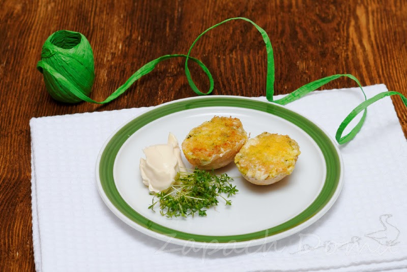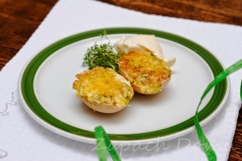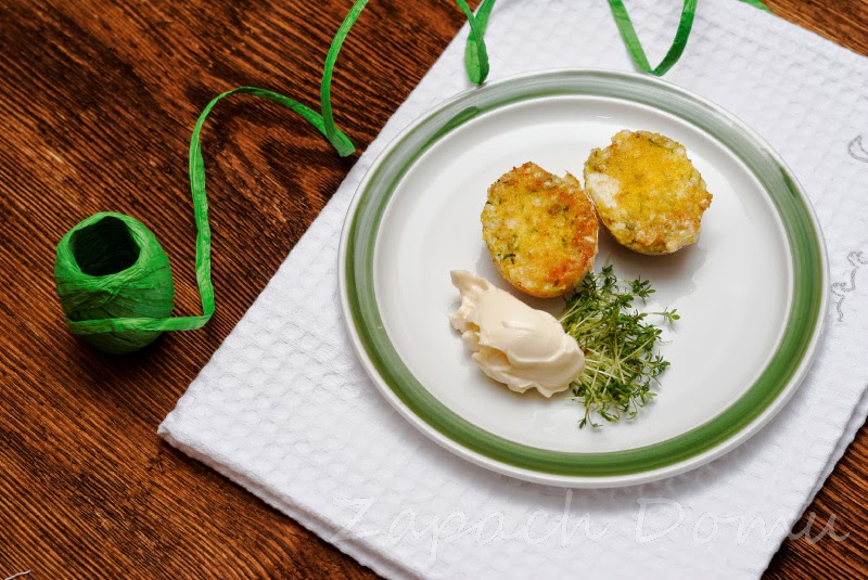 Okres Wielkanocny to czas, kiedy sprzedaż jajek sięga zenitu :) Nie wiem, jak u Was, ale ja często gotuję ich na śniadanie za dużo... Potem zostają, a ja patrzę na nie z pewnym wyrzutem sumienia. Czasem zrobię z nich pastę, czasem zużyję do sałatki... Ale nie byłabym sobą, gdybym nie szukała innych metod wykorzystania ugotowanych zimnych jajek :) Smażone faszerowane jajka widziałam kiedyś w jakieś gazecie. Receptury nie udało mi się odnaleźć, ale ta - zaimprowizowana przeze mnie - przypadła nam do gustu :)