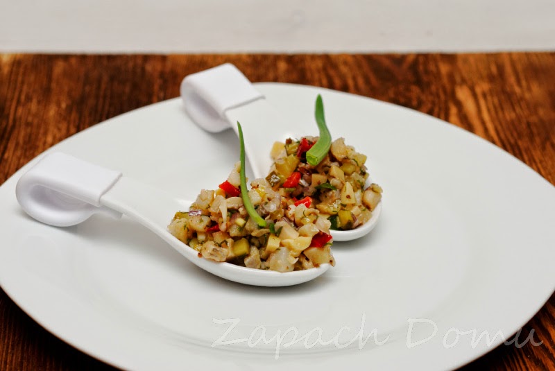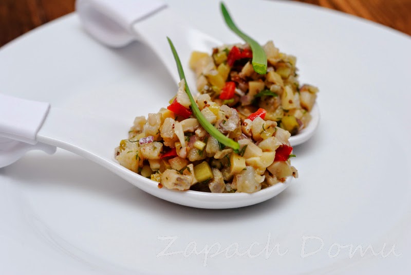 Szukając pomysłu na wielkanocnego śledzia - właściwie nie ma u nas świąt bez jakiejś jego wersji - natknęłam się na dania a'la tatar. Drobno pokrojony śledź, cebulka i różne - wedle uznania - dodatki. Taki śledź pięknie wygląda, a jak smakuje... Polubiliśmy go od razu, dlatego też szybciutko go Wam polecam.