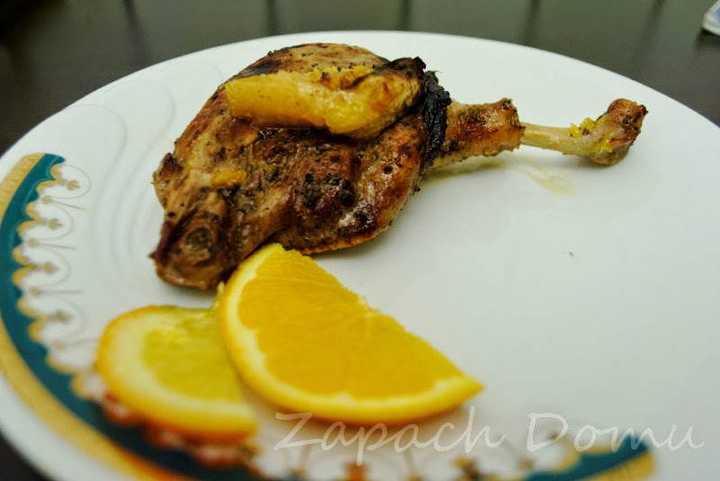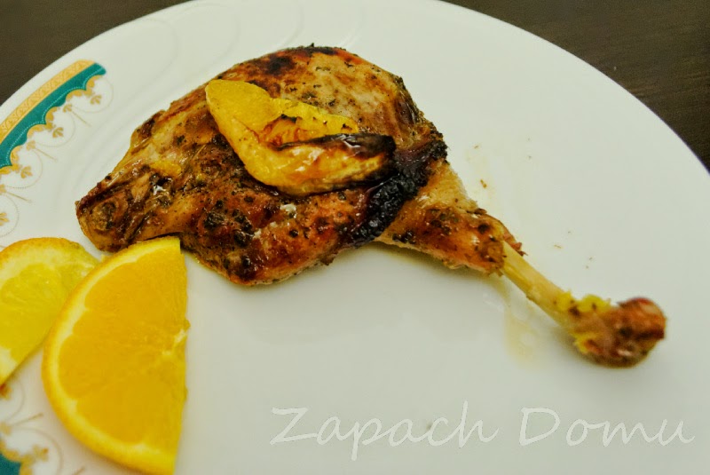 Piekarnik nagrzej do 220-230 st. W brytfannie ułóż udka, polej marynatą, ułóż wyfiletowane cząstki pomarańczy i wstaw do piekarnika. Po 10-15 minutach zmniejsz temperaturę do 180 st., przykryj brytfanne i piec jeszcze 1,5 godziny. Podczas pieczenia polewaj kaczkę sosem.