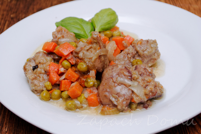 Wątróbkę umyj, osusz, pokrój na kawałki i oprósz mąką. Obsmaż na rozgrzanym oleju i włóż na podduszonych warzyw. Duś razem kilka minut.