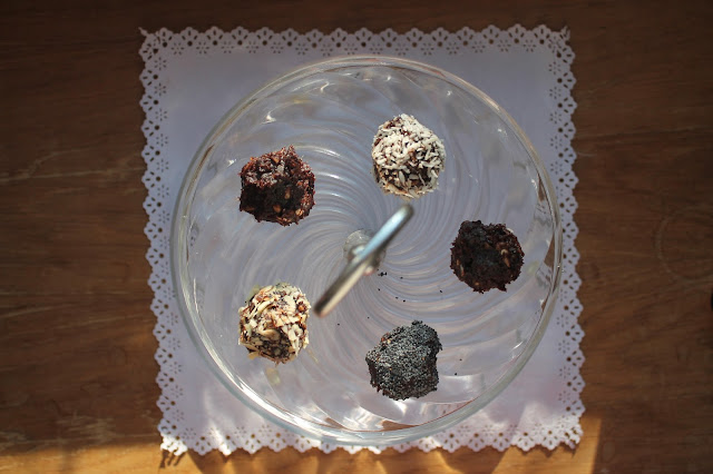 Są takie dni, kiedy ochota na słodkie przychodzi nagle i nie chce sobie iść. Najchętniej wzięłabym wtedy paczkę ciastek i bez opamiętania wszystkie zjadła. Na szczęście mój mózg, mimo wysokiego zapotrzebowania na cukier, wciąż pracuje. Dlatego wtedy z pomocą przychodzą domowe, zdrowe słodkości, których przygotowanie jest bajecznie proste, a smak... po prostu nieziemski. Mimo, że bazą tutaj są daktyle i można byłoby się po nich spodziewać dużej słodkości całych kulek, to dodatek ciemnego kakao sprawia, że zaczynają bardziej przypominać trufle.