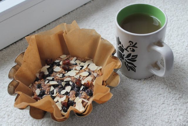 Dzisiaj na stół wjechała pieczona owsianka, z dodatkiem owoców i bakalii. Pierwszy raz robiłam tego typu śniadanie i muszę przyznać, że naprawdę pozytywnie się zaskoczyłam! :)