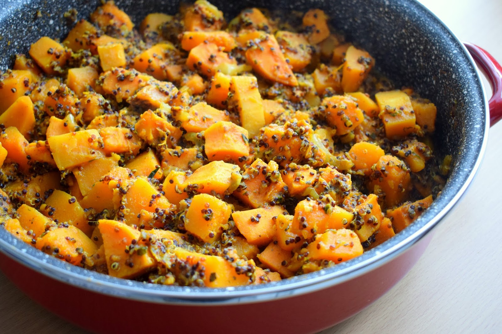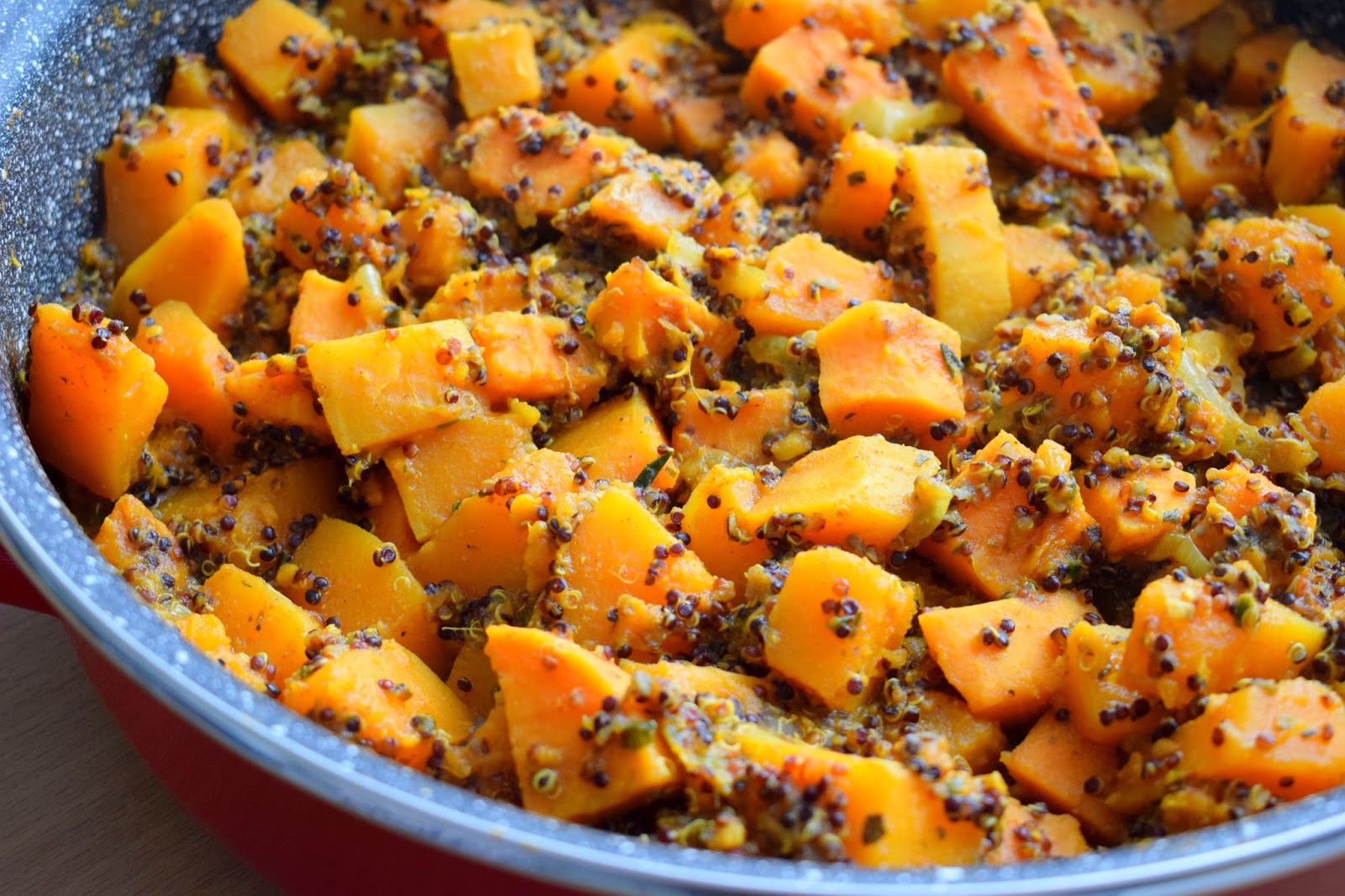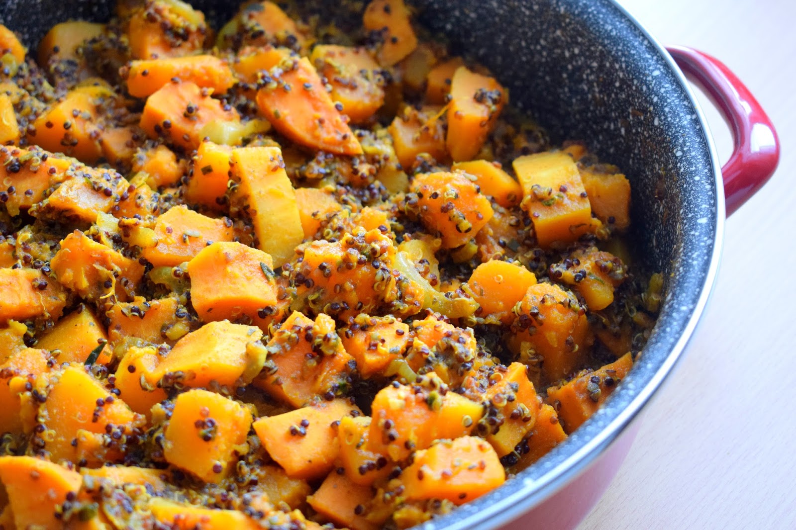 Niegdyś nie przepadałam za batatem, czyli słodkim ziemniakiem, a teraz znajduje się w moim jadłospisie przynajmniej raz w tygodniu. Bardzo go polubiłam, więc dodaję go do większości potraw. Poniżej przepyszne połączenie pomarańczowych warzyw - wcześniej wspomnianego batata oraz dyni piżmowej. Innym znaczącym dodatkiem jest quinoa, w wersji czarno-czerwonej :) Dużo przypraw, dzięki którym aromat wydobywający się podczas gotowania jest niezwykle intensywny :)