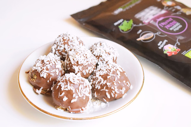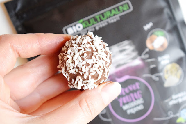 Biokulturalni, więcej o tym produkcie poczytacie na końcu wpisu. Kulki finalnie postanowiłam jeszcze skąpać w czekoladzie i obsypać wiórkami koksowymi. Zabieg ten niestety wpłynął na wzrost kaloryczności tych słodkości, ale w końcu czekolada jest także źródłem prozdrowotnych flawonoidów i innych cennych składników.
