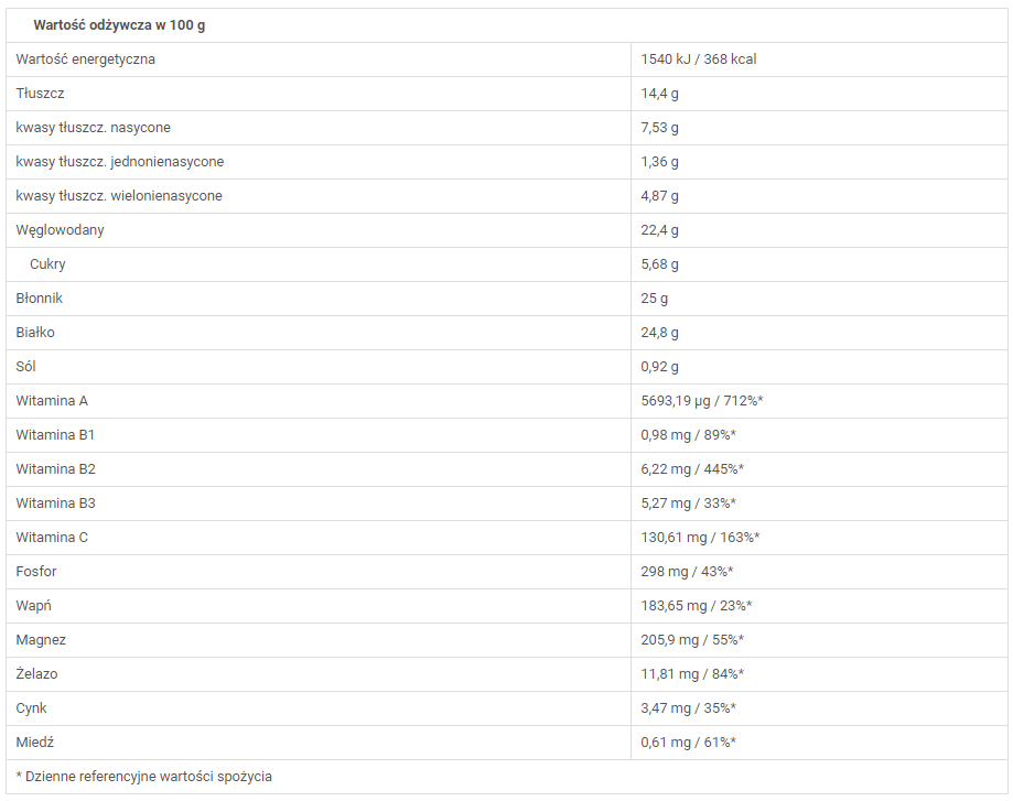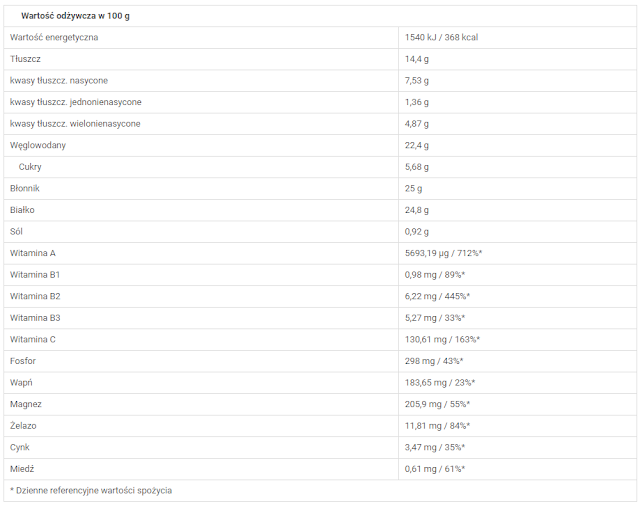 W tym produkcie spodobał mi się dodatek moringi, dzikiej róży czy borówek amerykańskich, które stanowią źródło drogocennych antyoksydantów, walczących w naszych organizmach z wolnymi rodnikami, stresem oksydacyjnym. Są także bogate w witaminę C, co widać wyraźnie na poniżej zamieszczonej tabelce z wartościami odżywczymi produktu. Więcej informacji na temat tego i innych produktów marki znajdziesz na stronie