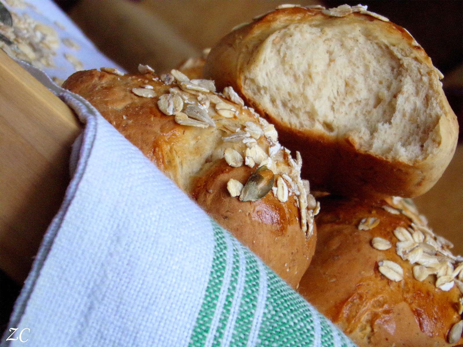 3. Wyrośnięte ciasto jeszcze raz zagniatamy i formujemy z niego bułeczki. W zależności jakiej wielkości chcemy bułki, mi wyszło 10 sztuk. Bułeczki układamy na blaszce wyłożonej papierem do pieczenia, smarujemy jajkiem i posypujemy płatkami owsianymi lub pestkami słonecznika i dyni. Pieczemy przez 15 min.