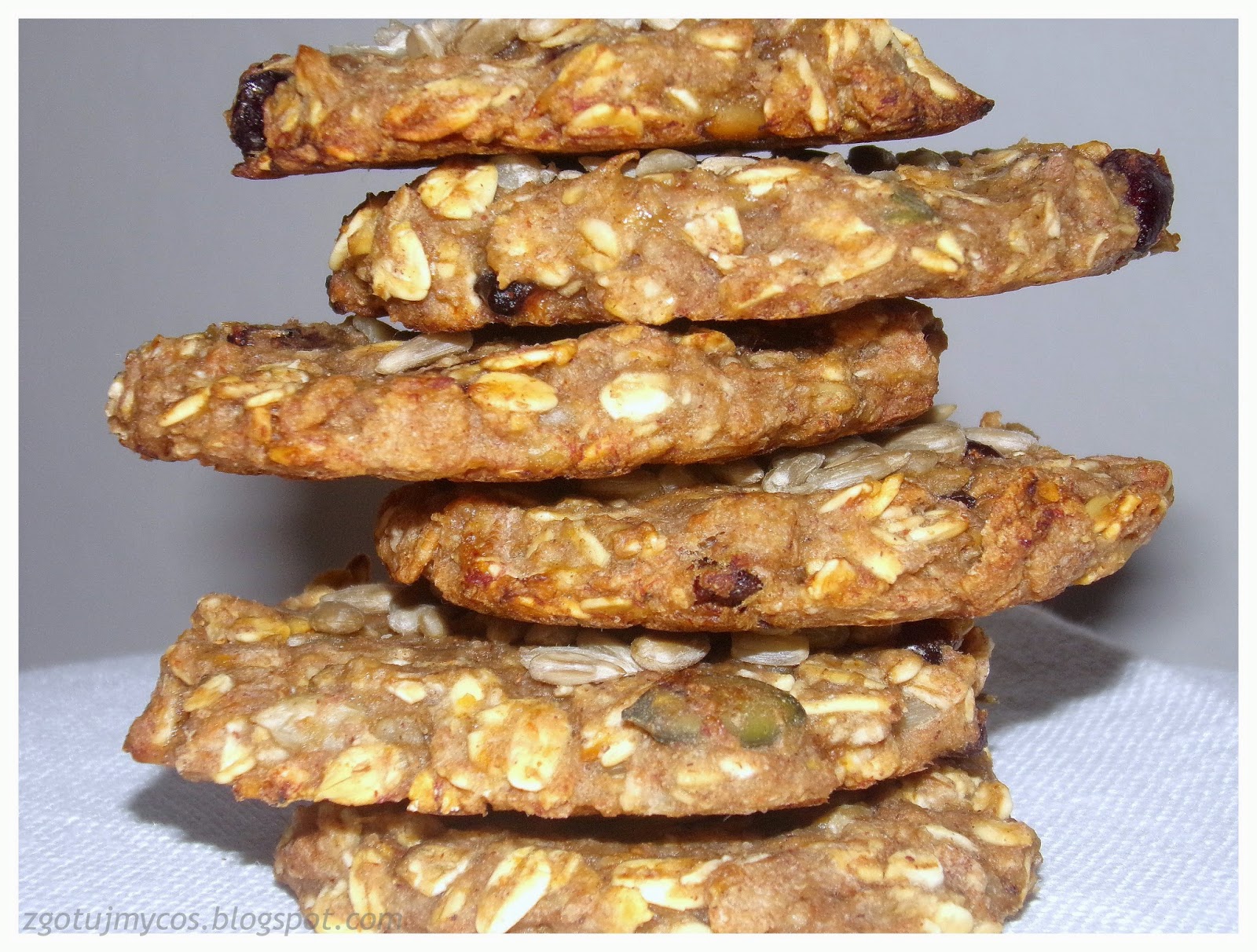 Na wyłożonym na blaszce papierze do pieczenia formować łyżką okrągłe placki. Wielkość zależy od upodobań. Pamiętać należy, żeby ciastka nie były zbyt grube, bo się nie upieką w środku. Na wierzch można jeszcze posypać pestkami słonecznika. Tak przygotowane ciastka wstawić na 15 minut do rozgrzanego piekarnika i piec w 180 st.C. Po upieczeniu ciastka są lekko ciągnące, ale jak ostygną stają się chrupiące. Ciastka można przechowywać w pudełku do 3 dni.