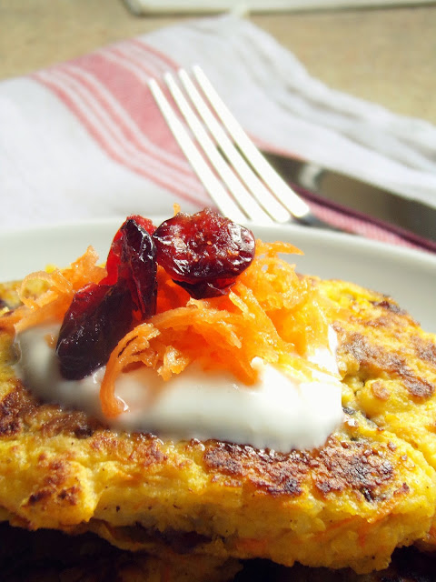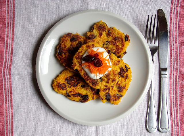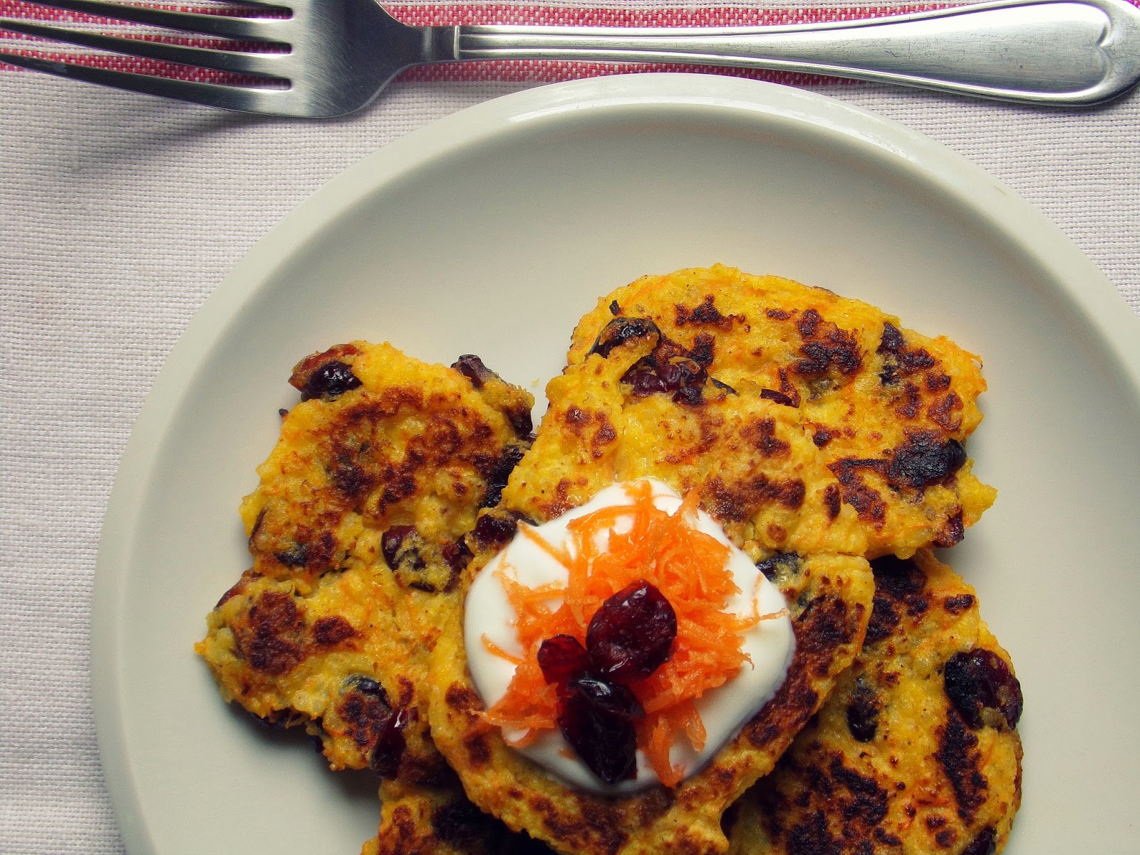 Kaszę ugotować i wyłożyć na talerz żeby ostygła. Dodać do niej jajko, startą na drobnych oczkach marchewkę, jogurt, mąkę i żurawinę. Wszystko dokładnie wymieszać. Jeśli będzie za rzadkie, to można dodać jeszcze odrobinę mąki. Na odrobinie rozgrzanego oleju kłaść łyżką okrągłe placki, lekko rozpłaszczając. Smażyć z obu stron, aż utworzy się chrupiąca powłoka. Można podawać polane odrobiną jogurtu.
