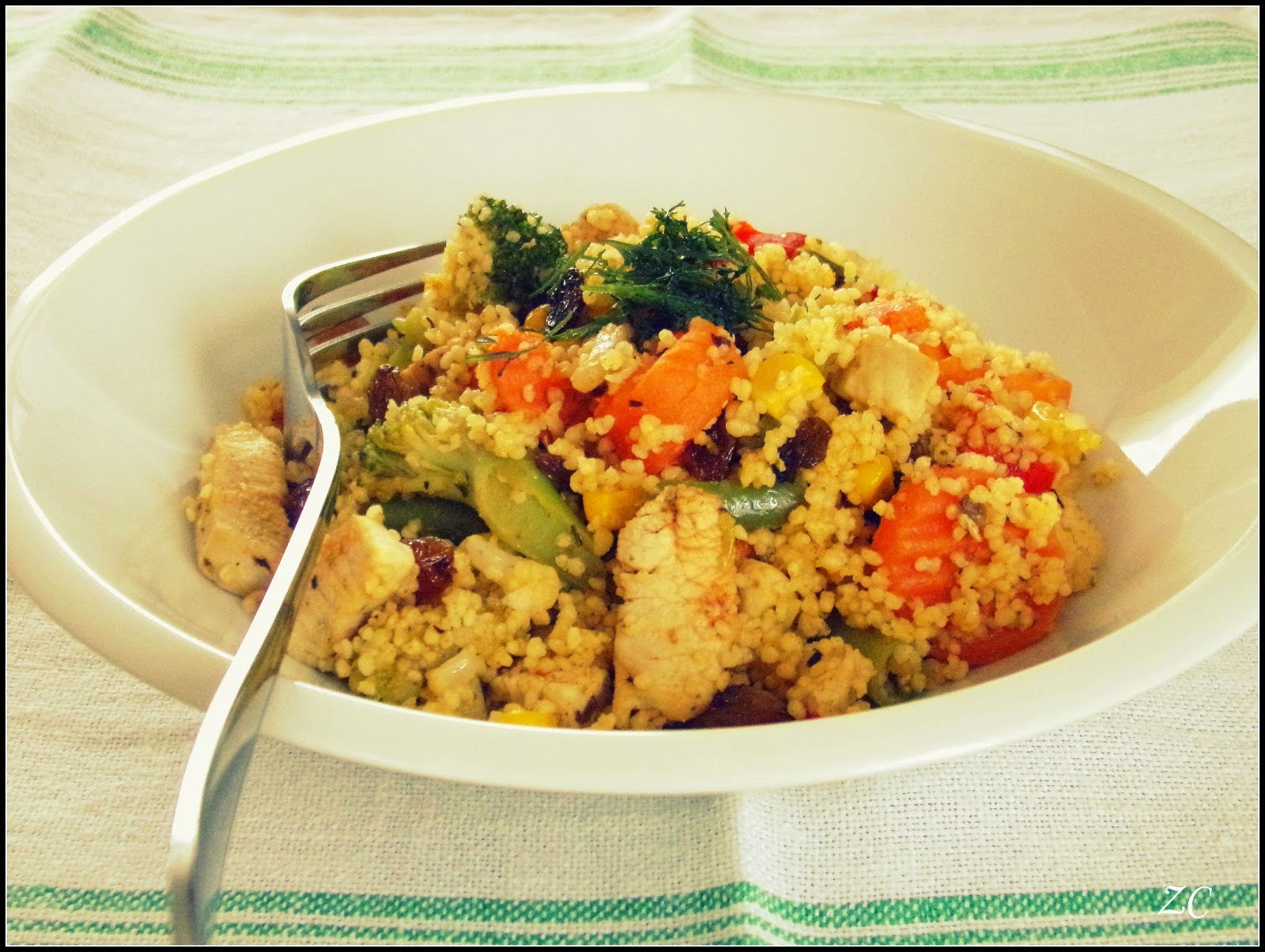 Kuskus to lekka kasza, mająca dużo błonnika oraz białka (więcej niż ryż). Jeśli ktoś ma problemy z żołądkiem, może śmiało po nią sięgnąć. Kuskus to chyba moja ulubiona kasza. Można kombinować z nią na różne sposoby. Na ciepło do mięs, na zimno do sałatek, a nawet do deserów. Jednak dzisiaj zdecydowałam się podać Kuskus w dwojaki sposób, dodając do niej ostrego kurczaka i słodkie rodzynki. Gotowi na przełamanie smaków? Ja już się zajadam.
