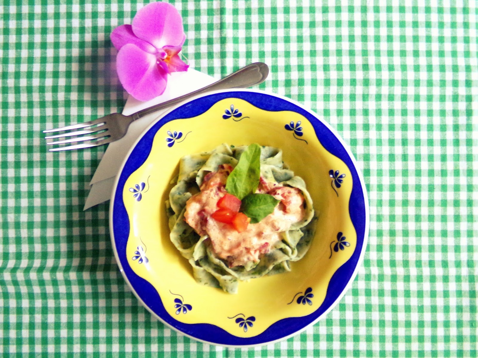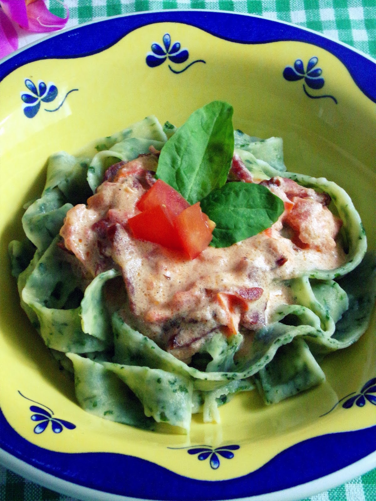 Wyszedł delikatny i jedząc go poczujecie ten specyficzny smak szpinaku. Moja propozycja na dzisiejszy obiad to makaron szpinakowy podany z sosem na bazie słodkiej śmietany ze świeżymi pomidorami, szynką i czosnkiem. Zapraszam ! :)