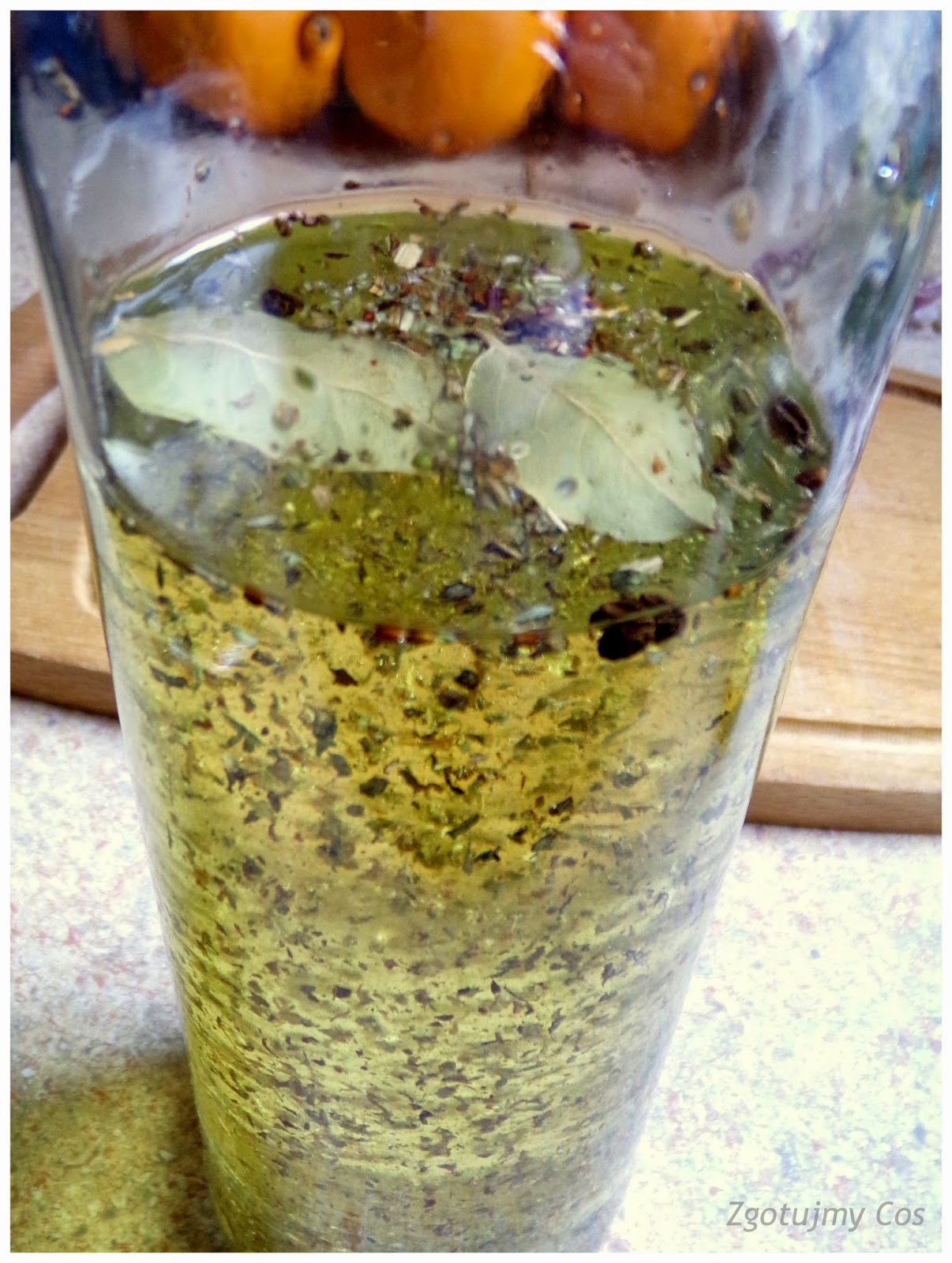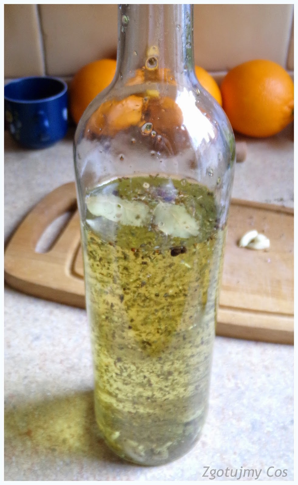 Czosnek obieramy i kroimy w grubsze plasterki. Wrzucamy go do uprzednio przygotowanej szklanej butelki wraz z ziołami. Całość zalewamy olejem i odstawiamy na 3 tygodnie w ciemne i suche miejsce. Jeśli uważacie, że po 3 tygodniach nie ma intensywnego smaku i aromatu i wolicie żeby taki był, to można odstawić jeszcze na tydzień.