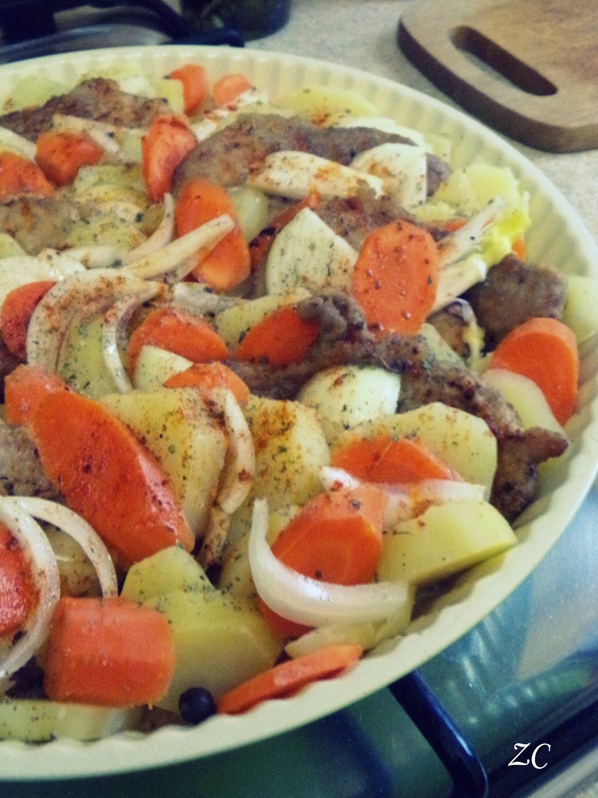 4. Na blaszkę układamy schab i warzywa na przemian, posypując ostrą papryką i ziarenkami kolorowego pieprzu oraz ziela angielskiego. Całość można podlać jeszcze 3 łyżkami oleju aromatyzowanego i połową szklanki wody. Piec w 180 st.C aż warzywa i mięso będą miękkie.