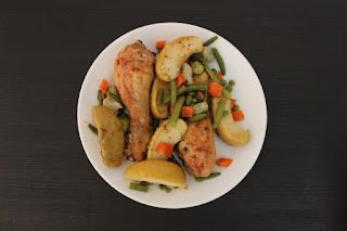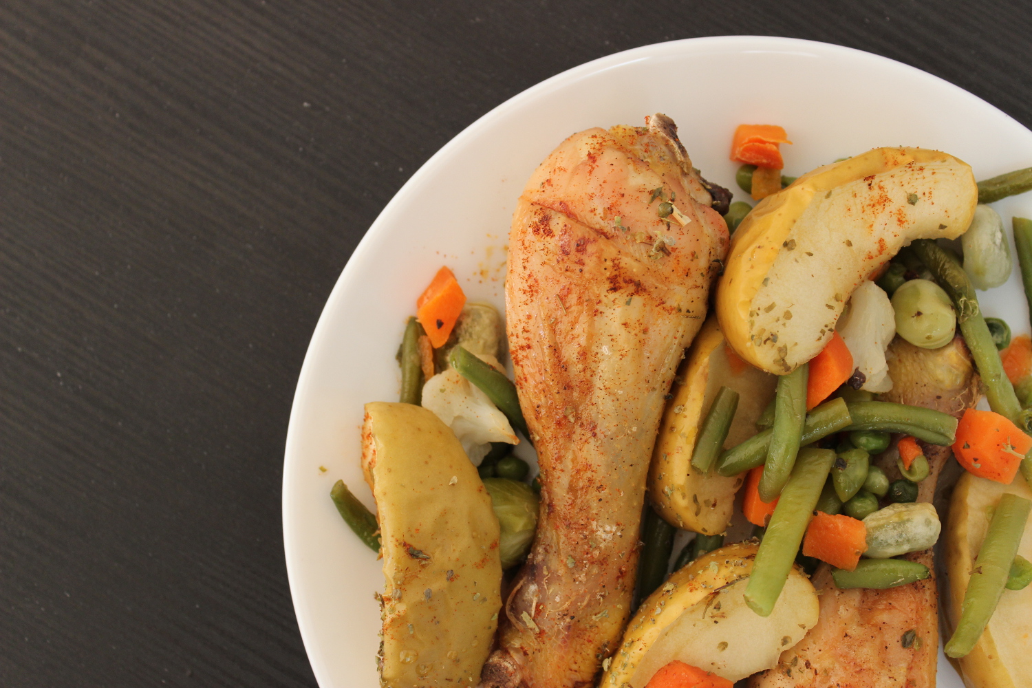 Dookoła podpieczonych pałek rozsypać mrożone warzywa. Całość piec 15 minut.