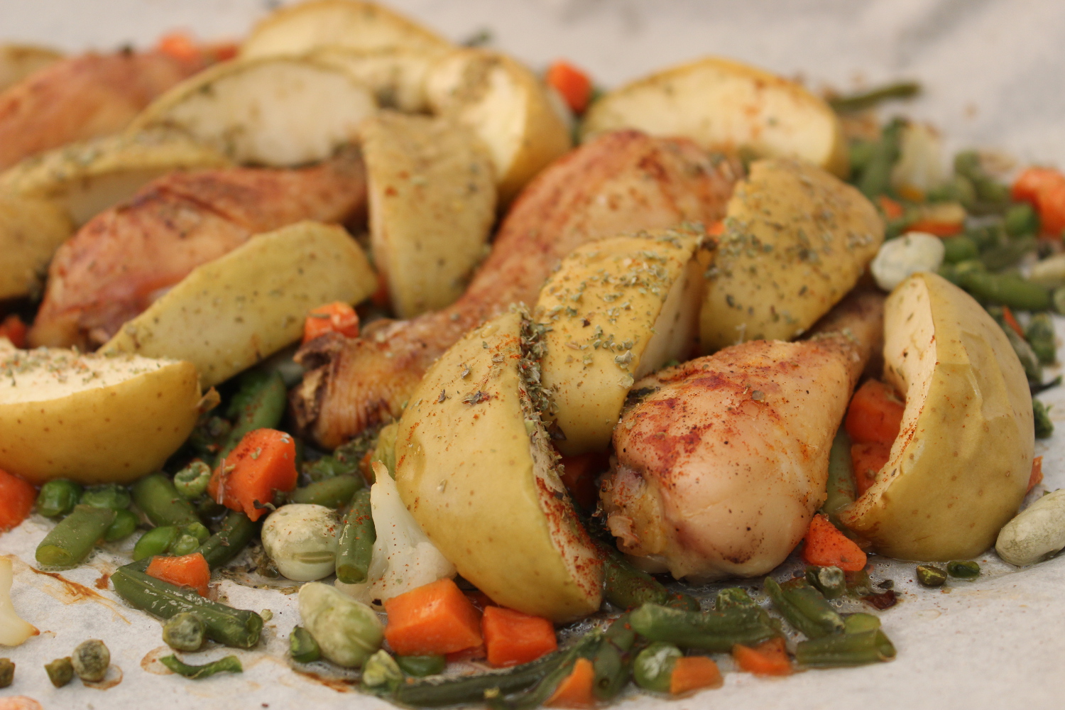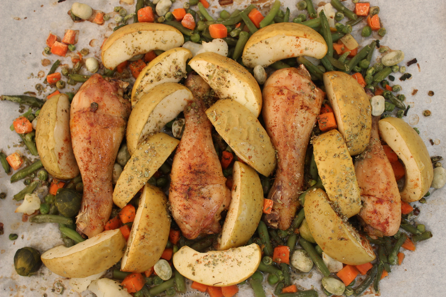 Chociaż połączenie składników może wydawać się nietypowe - efekt jest pyszny. Pałki kurczaka z chrupiącą skórką i pieczone warzywa świetnie łączą się z delikatnym posmakiem słodyczy miodu i jabłek. W sezonie można użyć ulubionych świeżych warzyw.Składniki (4 porcje)-8 pałek kurczaka