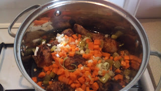 Kiedy mój kurczak ma już odpowiednią barwę przekładam go do garnka, zalewam ciepłą wodą. Niektórzy dodają tłuszcz z patelni, dla mnie to wtedy z tłuste. Moim zdaniem starczy to, co wydobędzie się z mięsa. Na wierzch posypuję wszystkie pokrojone warzywa i wrzucam kostkę bulionową.