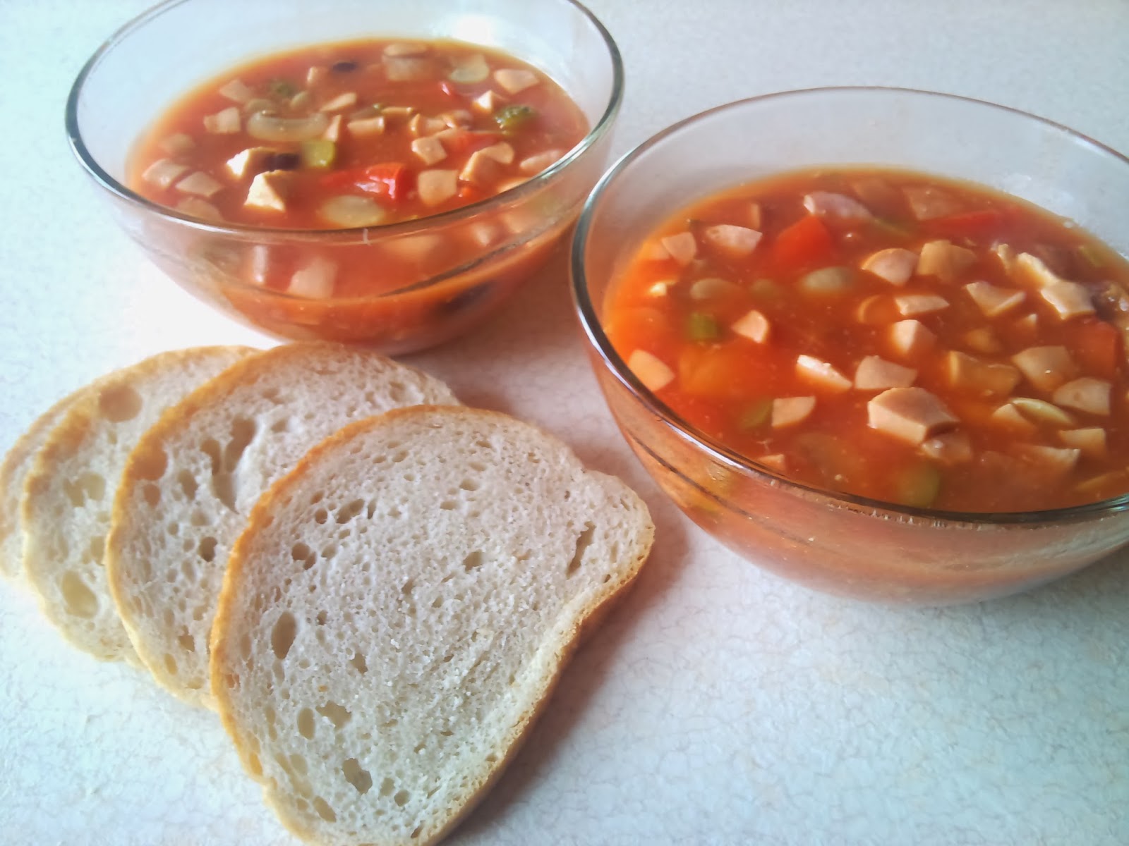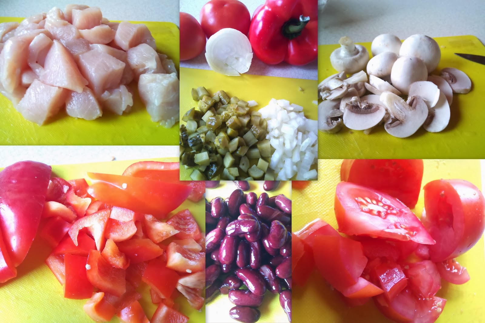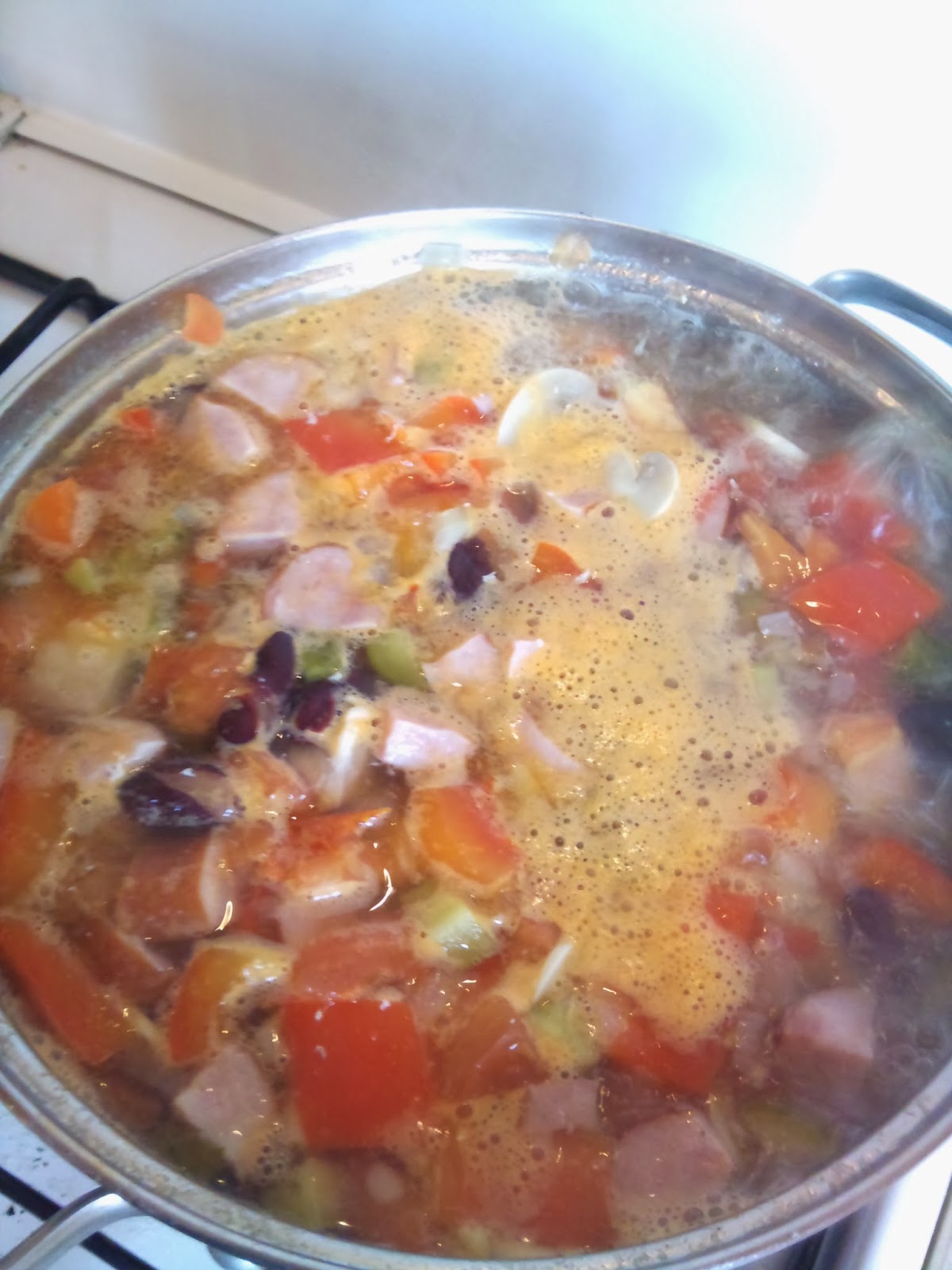 Ta potrawa nie wymaga również dużo naszego zainteresowania. Postawiona na lekkim ogniu gotowała się około 40 minut. Jeżeli robi się wersję bez kurczaka wystarczy 20 minut. Po tym czasie dodałam sok pomidorowy, przecier, pieprz i chili. Ja akurat lubię ostre potrawy ale spokojnie starczy też słodka papryka ;)